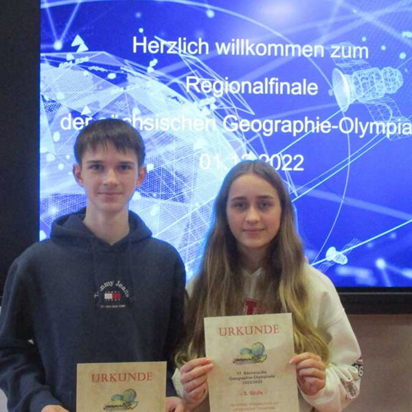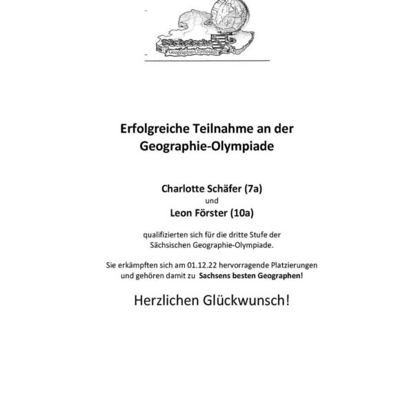 Geografiewettbewerb – wir waren dabei Beitrag veröffentlicht:6. Dezember 2022 Charlotte Schäfer (7a) und Leon-Maik Förster (10a) gehören zu Sachsens besten Geografen. Sie qualifizierten sich für die dritte Stufe der sächsischen Geografie-Olympiade und erkämpften sich am 01.12.2022 hervorragende Plätze in Dresden. Das könnte dir auch gefallen Crosslauf am 15.04.2024 23. April 2024 Tag der offenen Tür 13. Dezember 2022 Mathewettbewerb an der OS Kötitz 5. November 2023