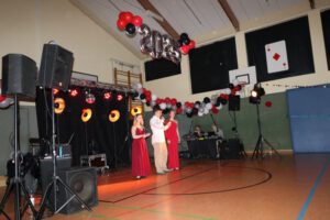 Mit dem zum dritten Mal zelebrierten Hausball unter dem Motto „Casino Night“ können wir von einer neuen Tradition unserer Schule sprechen. Es war wieder ein unvergessliches Event sowohl für unsere Absolventen der diesjährigen Abschlussklassen als auch für alle Schüler der 5. bis 9. Klassen, die sich eine Eintrittskarte gesichert hatten, aber auch für alle an diesem Abend engagierten Lehrer und Beschäftigten unserer Schule. Das Motto weckte die Kreativität aller Beteiligten bei der Ausgestaltung und Dekoration der Turnhalle sowie den Gängen, aber auch dem ganz persönlichen glamourösen Style. Nach dem Beschreiten des roten Teppichs und der obligatorischen Kontrolle am Eingang konnte man sich ins Vergnügen stürzen. Eine wieder beeindruckend verwandelte Turnhalle mit Glitzer-, und Ballonketten, tollen Beleuchtungseffekten, Spieltischen für Black Jack, Roulette oder Billiard eröffnete neben der zum Tanzen einladenden Musik also auch die Möglichkeit sich wie die Reichen und Schönen dem Glücksspiel zu widmen. Die Gewinne waren kostbare gute Laune und Spaß mit Freunden. Die gab es auch bei sehr unterhaltsamen Wettspielen oder Showeinlagen. Ein Highlight war mit Sicherheit der Tanz unserer Masked Dancerlehrer. Schweißgebadet und mit ganzer Hingabe hielt es dann bei der von T-Rex, Axolotl, Oktopus angeführten Polonaise durch die Halle auch niemanden mehr am Rand des Geschehens. Erfrischung gab es an der selbstverständlich alkoholfreien Cocktailbar und hungern musste auch niemand. Es gab die beliebten Hotdogs und andere leckere Snacks. Dokumentierte Erinnerungen konnte man sich in der Fotoecke auf Polaroid oder digital sichern. Die unvergesslichsten Bilder jedoch sind die in den Köpfen aller Teilnehmenden. Ein Dank an alle, die dieses Event wieder mit ganz viel Engagement in vielen Stunden der Vorbereitung möglich machten, vor allem Dank an Frau Friedrich, unsere geduldige und klar strukturierte Eventmanagerin, Herrn Bernau, der immer einen großen Beitrag leistet, seine Turnhalle mit viel Zeit und Kraft in eine Feierlokation zu verwandeln und wiederum zurückzubauen, aber auch unserem tollen Hausmeister, Herrn Fischer sei hier gedankt für die Zusatzstunden und akrobatischen Einsätze auf hohen Leitern. In diesem Schuljahr haben wieder einige Schüler der Abschlussklassen selbst einen großen Anteil am Gelingen der Veranstaltung, so konnte Celina Arnhold aus der 10a durch ihr Engagement zum Beispiel einige Sponsoren akquirieren.